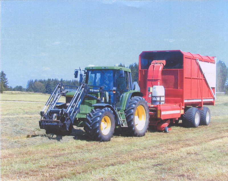 i 2 ensilagetorn och blåses in till foderbordet där det fördelas